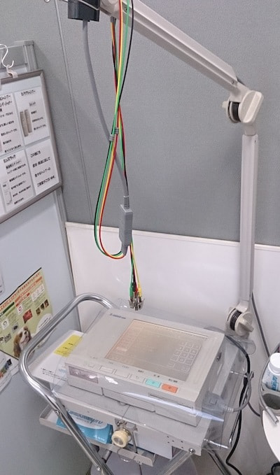 | レントゲン関係 | コニカ製CRデジタルレントゲンシステム、ノート型カラーエコー/GE LogiqBookXP、カラーエコー超音波診断装置/GE Vivid 7 Dimension、アンプ付き聴診器/東京メニックス ハートソナーHS-402用聴診器型マイク、リットマンデジタル聴診器が2本、動物用血圧計/ペトラスPLUS、動物用血圧計/ペットマップ、動物用心電図/フクダM-E D300 |