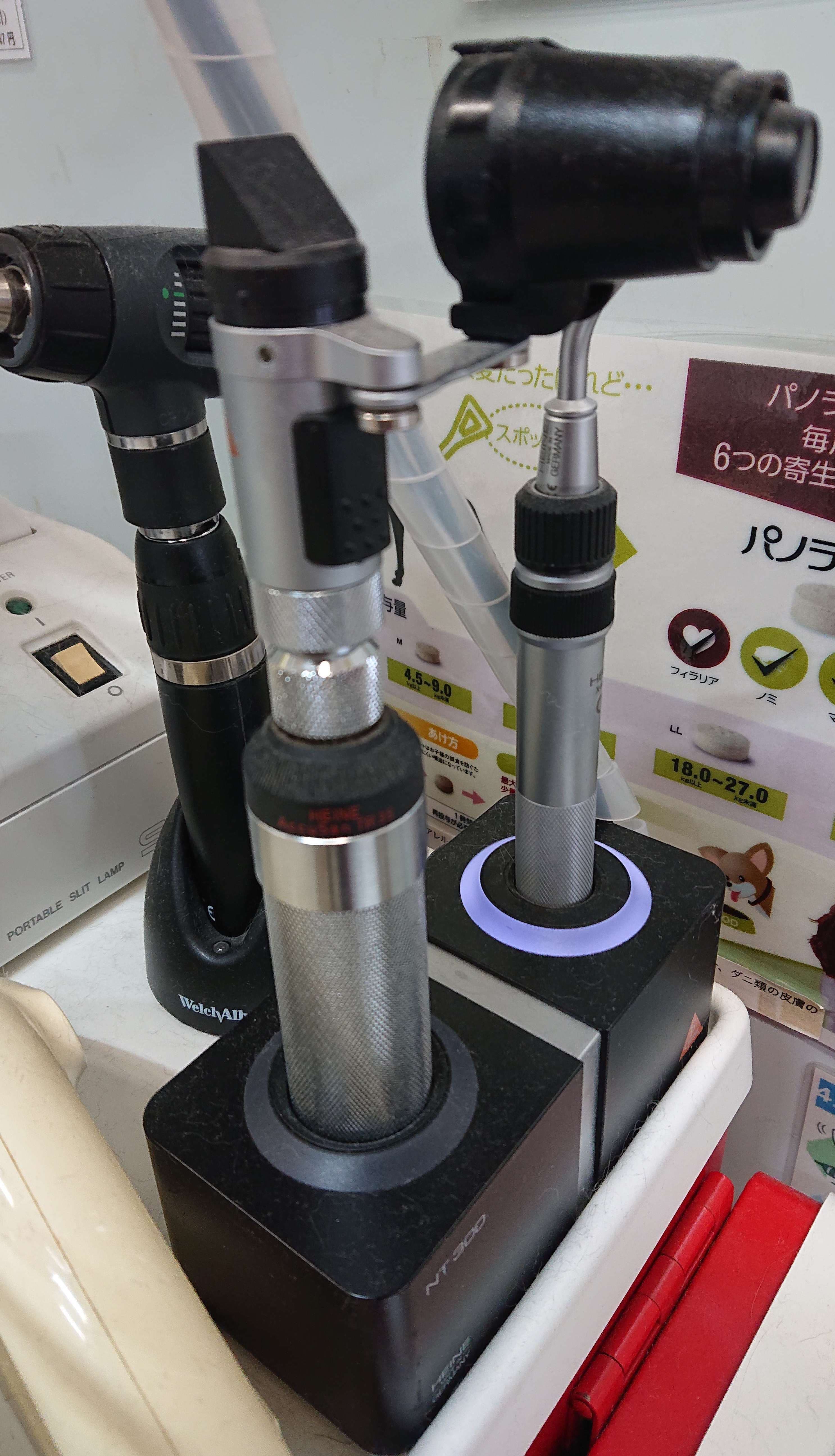 | 眼科関係 | 眼圧計/TONO-PEN VET、ポータブルスリットランプ/KOWA SL-14、HEINE充電ハンドルセット、HEINEハンドヘルドスリットランプヘッド(+10倍アタッチメント)、HEINEフィノル氏トランスイルミネーターヘッド、HEINEベータ200直像鏡ヘッド、NEINE非球面レンズ、WelcyAllyn充電式ハンドル、WelcyAllyn同軸検眼鏡、眼底カメラ/WelcyAllynパンオプティック、WelcyAllyn iExaminerシステム(iPhone用セット) |