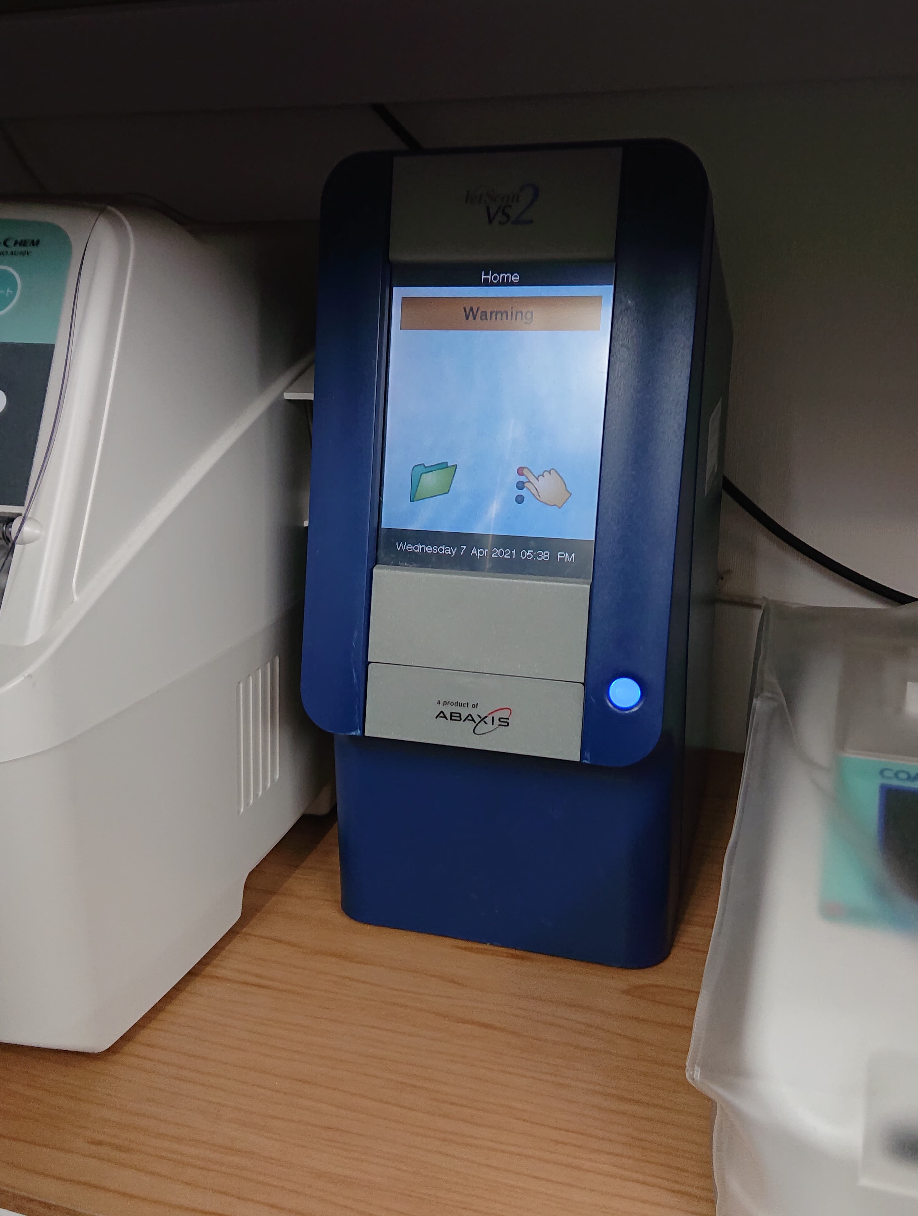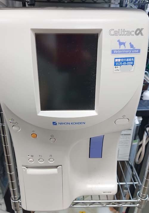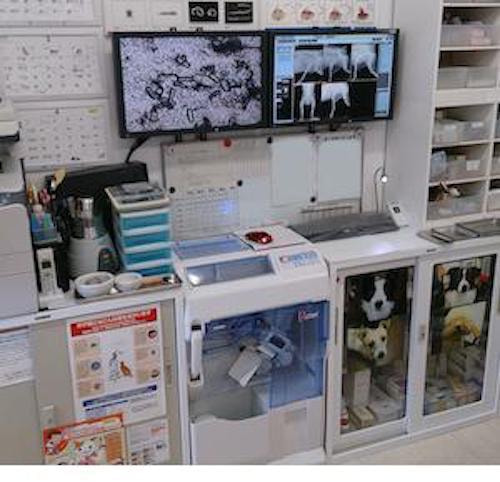 | 血液検査関係 | 生化学測定器/IDEXX カタリストONE(2021年追加)、生化学測定器/ドライケムNX700V(2022年追加)、生化学測定器/VetScan(血液ガス測定可)、自動血球計算機/シスメックス Poch-100iV Diff、血球計算機/IDEXX プロサイトDX(2021年追加)、凝固系測定器/COAG2-NV、免疫反応測定装置/ドライケムAU10V、犬CRP測定器/Laser CRP-2、測定器/IDEXX SnapPro、電解質測定器/ドライケム800V、アンモニア測定器/ドライケム100N、血糖値測定/Horiba アントセンス3、血糖値測定/アルファトラック2 (他、予備 血球計算機/PCE-170C、ドライケム7000V/3000)管理システム/IDEXX ベットラボステーション・ペットクルー電子カルテシステム |