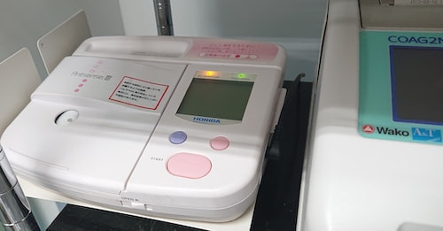血液の凝固作用を測定するマシンです。安全に手術を行うために術前検査に使う事があります。