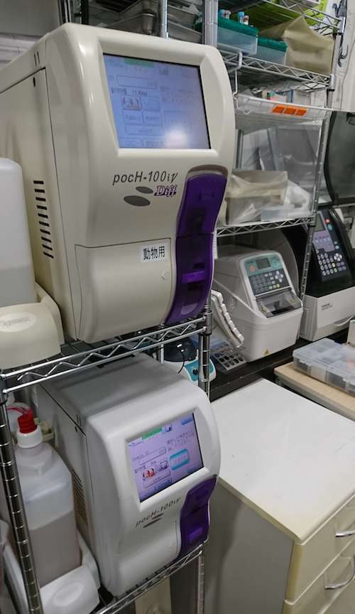 白血球・赤血球などの値、腎臓・肝臓・炎症などの生化学血液検査は院内検査が可能です。血液検査のマシンだけで8台ほど所有。最短20分程度で結果が出ますので、すぐに治療を行う事が出来ます。